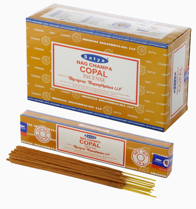 Encens copal Satya, Boite de 15g, un encens indien au parfum de copal et de résines. Issu de la grande famille des encens indiens Satya Sai baba, l'encens copal au parfum fleuri aide à la concentration, créativité.