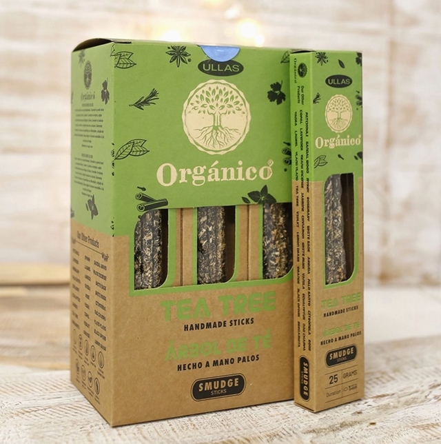 Encens d'arbre à thé Ullas. Fait main en Inde, ingrédients naturels et biologiques. La série Ullas Organic offre une nouvelle gamme premium qui garantit la pureté de ses matériaux, avec des ingrédients 100% naturels. Profitez de l'arôme intense de notre encens d'arbre à thé Ullas, fabriqué à la main avec des résines naturelles et des herbes spéciales, il dégage un arôme frais et herbacé, dérivé de l'essence pure de l'arbre à thé, connu pour ses propriétés purifiantes et revitalisantes. Cet arôme non seulement purifie l'environnement, mais aide également à améliorer la concentration et à favoriser une sensation de bien-être. Chaque bâton est plus épais que d'autres encens biologiques, garantissant une combustion longue.