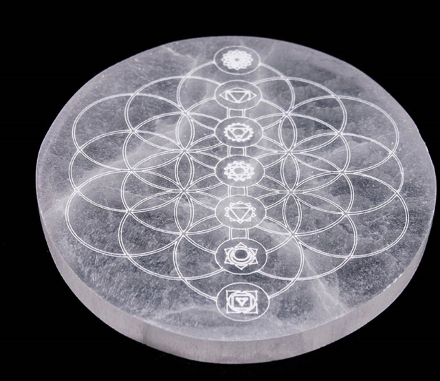 Plaque de rechargement en Sélénite Fleur de vie Chakra 14 cm